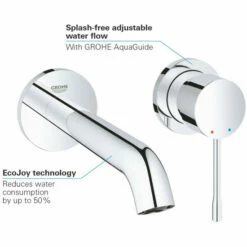 GROHE Essence 2-Loch-Waschtischbatterie Wandmontage Fertigmontageset für 23 571 (ohne Unterputz-Einbaukörper) GROHE StarLight Oberfläche GROHE EcoJoy 5,7 l/min Mousseur GROHE AquaGuide verstellbarer Mousseur Stichmaß 110 mm Ausladung 183 mmchrom