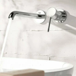 Das GROHE Essence 2-Loch-Waschtischbatterie für die Wandmontage wird ohne Unterputz-Einbaukörper geliefert und ist mit der GROHE StarLight® Chromoberfläche, dem verstellbaren GROHE AquaGuide Mousseur sowie einem Bedienhebel aus Metall ausgestattet. Die Ausladung beträgt 183 mm, das Stichmaß 110 mm und der benötigte Mindestdruck liegt bei 1,0 bar.