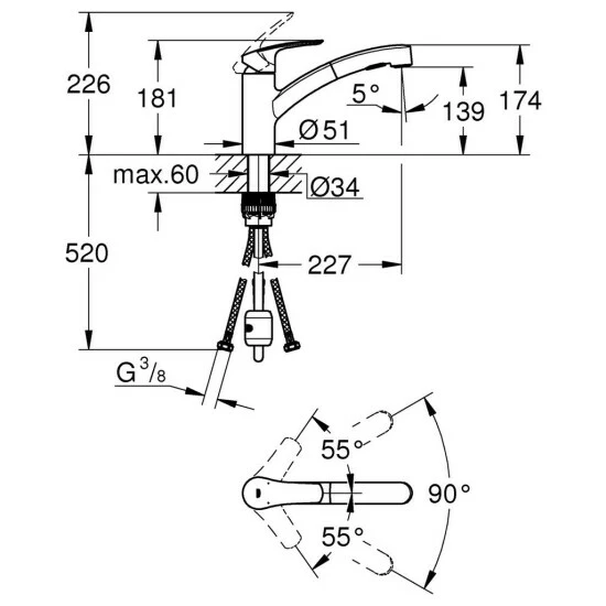 GROHE Eurosmart Einhand-Spültischbatterie, 1/2“ flacher Auslauf Einlochmontage GROHE StarLight Oberfläche GROHE SilkMove 35 mm Keramikkartusche mit integriertem Temperaturbegrenzer herausziehbare Dual Spülbrause Umstellung: Laminarstrahl/SpeedClean Brausestrahl automatische Rückstellung auf Laminarstrahl variabel einstellbare Mengenbegrenzung schwenkbarer Gussauslauf Schwenkbereich 90 Grad GROHE Zero getrennte innenliegende Wasserwege – kein Kontakt mit Blei oder Nickel innerhalb der Armatur flexible Anschlussschläuche GROHE FastFixation Plus Schnellbefestigungssystem Eigensicher gegen Rückfließen