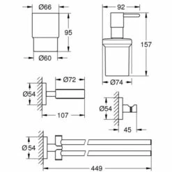 Metall · bestehend aus: Seifenspender mit Halter · Glas mit Halter · Handtuchhalter · 2-armig · Bademantelhaken · verdeckte Befestigung · StarLight Oberfläche