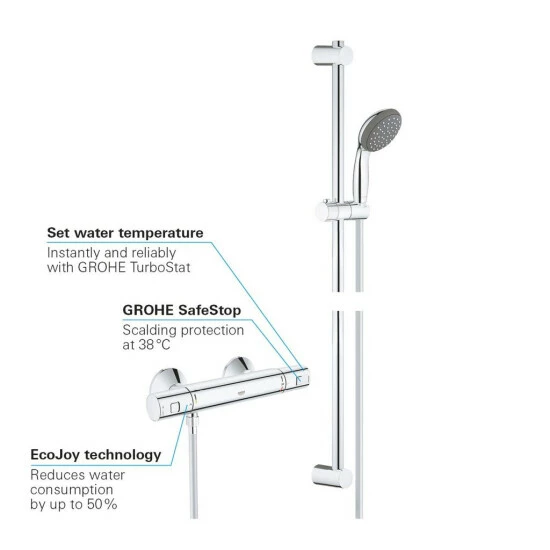 Ein großartiges Duscherlebnis beginnt mit einer zuverlässigen Leistung. Der Grohe Precision Start Duschthermostat sorgt nicht nur dafür, dass die Temperatur Ihrer Dusche stets konstant und ohne lästige Schwankungen bleibt, er bietet auch großartige, familienfreundliche Sicherheitsfunktionen. Dieses Set enthält eine Brausestange und eine Handbrause mit ShockProof Silikonring, der sie vor Schlagschäden schützt. Die Grohe DreamSpray Technologie stellt einen gleichmäßigen Wasserfluss an allen Düsen sicher. Und die Grohe EcoJoy Funktion verringert den Wasserverbrauch beim Duschen um bis zu 50 %. Familien werden die Grohe SafeStop Taste lieben, die die Temperatur auf 38° C begrenzt und so Verbrühungen verhindert. Und die glänzende Grohe Starlight Edelstahloberfläche ist kratzfest und pflegeleicht. Sie sieht auch nach Jahren immer noch makellos aus.Farbe: chromMaße: 695 x 170 x 170 mmMaterial: Metallhält konstant die gewünschte WassertemperaturEigensicher gegen Rückfließen, eingebaute