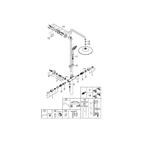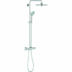 GROHE Euphoria System 260 Duschsystem mit Thermostatbatterie für die Wandmontage bestehend aus: horizontal schwenkbarer 450 mm Duscharm Aufputz-Thermostat mit Aquadimmer Funktion ermöglicht den Wechsel zwischen: Euphoria 260 Kopfbrause (26 455) 3 Strahlarten: Rain, SmartRain, Jet mit Kugelgelenk, Drehwinkel +/- 15 Grad Handbrause Euphoria 110 Massage (27 221) 3 Strahlarten: Rain, SmartRain, Massage in der Höhe verstellbar mittels Gleitelement Brauseschlauch Silverflex 1.750 mm (28 388) GROHE TurboStat Kompaktkartusche mit Dehnstoff-Thermoelement GROHE SafeStop Sicherheitssperre bei 38 GradC GROHE SafeStop Plus optional einsetzbarer Temperaturendanschlag bei 43 GradC GROHE DreamSpray perfektes Strahlbild GROHE StarLight Oberfläche SpeedClean Antikalk-System Twistfree gegen Verdrehen des Brauseschlauchs für Durchlauferhitzer ab 18 kW/h geeignet Mindestdurchfluss 7 l/min optionales Zubehör: GROHE EasyReach Ablage (26 362)chrom