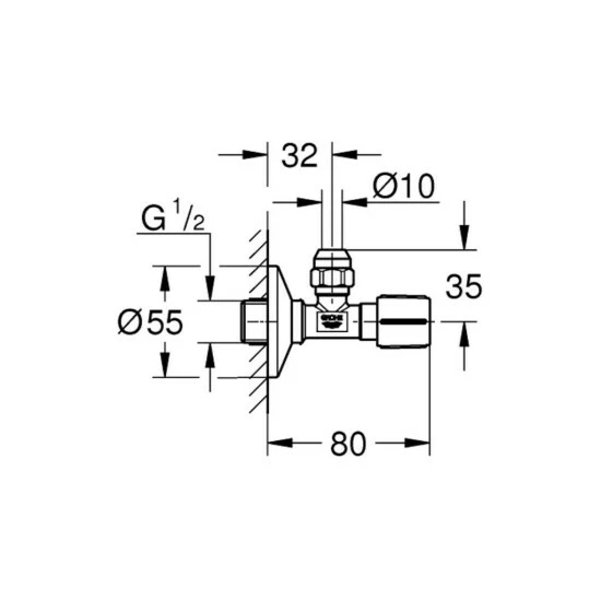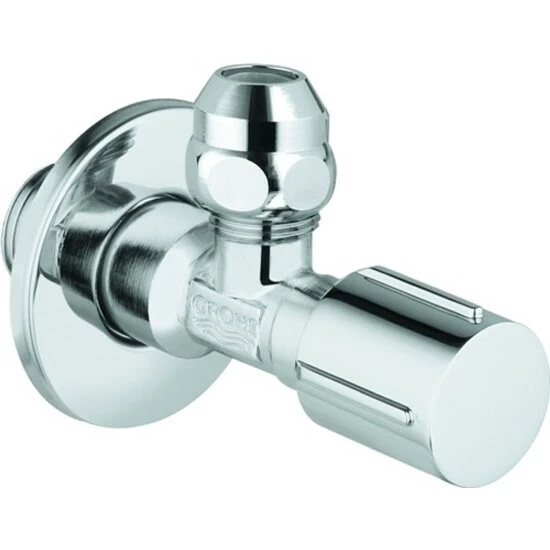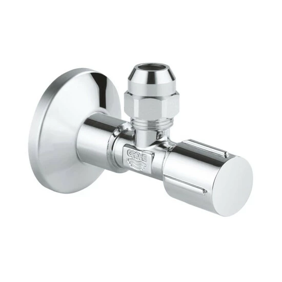 GROHE Eckventil, DN 15 angerauhtes Gewinde zum vereinfachten Eindichten Wandanschluss 1/2“ Abgang 3/8“ mit Längenausgleich mit Quetschverschraubung D: 10 mm wassergeschützte Spindelabsperrung, Messing, mit Fettkammer und doppelter O-Ring Abdichtung langer Schubschaft ergonomischer Metallgriff Markierung neutral Schubrosette aus Metall D: 55 mm GROHE StarLight Oberflächechrom