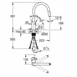 GROHE Eurosmart Cosmopolitan Einhand-Spültischbatterie, 1/2“ hoher Auslauf Einlochmontage GROHE StarLight Oberfläche GROHE SilkMove 35 mm Keramikkartusche GROHE EasyDock GROHE Zero getrennte innenliegende Wasserwege – kein Kontakt mit Blei oder Nickel innerhalb der Armatur herausziehbare Dual Spülbrause Umstellung: Laminarstrahl/SpeedClean Brausestrahl variabel einstellbare Mengenbegrenzung schwenkbarer Rohrauslauf Schwenkbereich 360 Grad Eigensicher gegen Rückfließen flexible Anschlussschläuche GROHE FastFixation Schnellbefestigungssystem