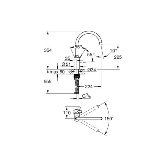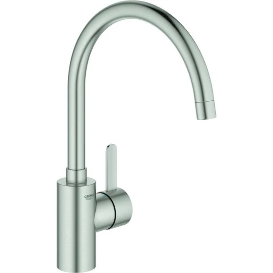 GROHE Eurosmart Cosmopolitan Einhand-Spültischbatterie, 1/2“ hoher Auslauf Einlochmontage GROHE StarLight Oberfläche GROHE SilkMove 35 mm Keramikkartusche GROHE Zero getrennte innenliegende Wasserwege – kein Kontakt mit Blei oder Nickel innerhalb der Armatur Auslauf mit Mousseur variabel einstellbare Mengenbegrenzung schwenkbarer Rohrauslauf Schwenkbereich wählbar: 0 Grad / 150 Grad flexible Anschlussschläuche GROHE FastFixation Schnellbefestigungssystem