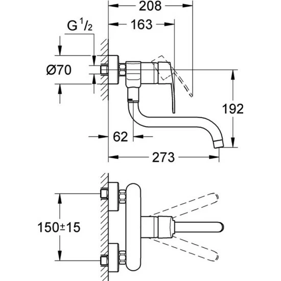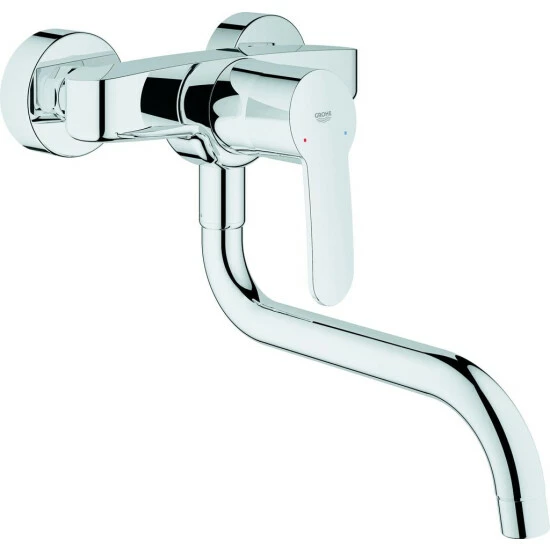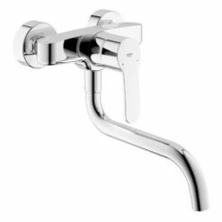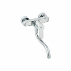 Die Grohe Eurostyle Cosmopolitan Einhand-Spültischbatterie DN 15 für die Wandmontage, ist ausgestattet mit einer GROHE SilkMove® 46 mm Keramikkartusche, der GROHE StarLight® Chromoberfläche, einer variabel einstellbaren Mengenbegrenzung und einem schwenkbaren Rohrauslauf mit einem wählbaren Schwenkbereich von 0° bis 150°. Der Auslauf hat eine Ausladung von 211 mm und zum Lieferumfang gehören außerdem ein Perlator und die S-Anschlüsse.