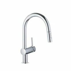 GROHE Minta Einhand-Spültischbatterie, DN 15 C-Auslauf Einlochmontage GROHE StarLight Oberfläche GROHE SilkMove 46 mm Keramikkartusche GROHE EasyDock herausziehbare Dual Spülbrause Umstellung: Laminarstrahl/SpeedClean Brausestrahl variabel einstellbare Mengenbegrenzung schwenkbarer Rohrauslauf Schwenkbereich 360 Grad integrierter Rückflussverhinderer Eigensicher gegen Rückfließen flexible Anschlussschläuche Schnell-Montage-System chrom