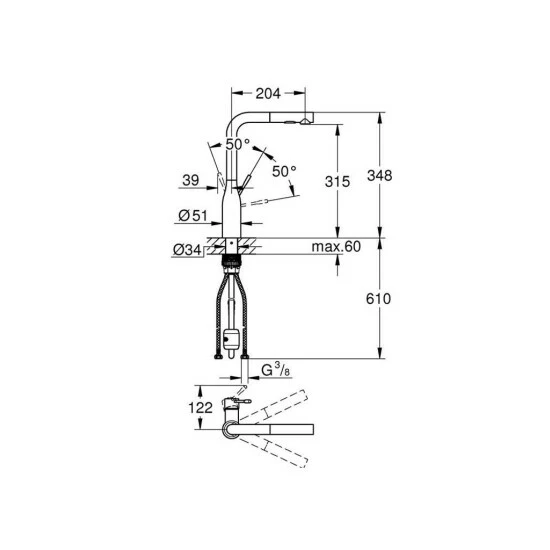 Essence Einhand-Spültischbatterie · 1/2“ Einlochmontage GROHE StarLight Oberfläche GROHE SilkMove 28 mm Keramikkartusche herausziehbare Dual Spülbrause Umstellung: Laminarstrahl/SpeedClean Brausestrahl a Weitere technische Eigenschaften: · Anschluss Vorlauf Schlauch (Verschraubung)· Anschlussmaß Zufuhr 3/8 Zoll· Anzahl der Armaturenlöcher 1-löchig· Anzahl der Griffe eingriffig· Aufbauhöhe gesamt 348mm· Aufbauhöhe Unterkante Hahnauslass 315mm· Ausführung Ablauf drehbar oben· Auslauftyp Rohr· Ausziehbarer Einlauf mit Handdusche Ja· Ausziehbarer Einlauf mit Perlator Nein· Geräuschklasse nach DIN-52 218 Gruppe I, <=20 dB(A)· Grundfarbe sonstige· Hahn einklappbar (Bajonett) Nein· Material Hahn Messing· Mit Absperrventil für Anschluss externer Nein· Mit Griffen Ja· Mit Heißwasser-Sparfunktion Nein· Mit Kupplungen Nein· Mit Rosetten Nein· Mit Temperaturbegrenzung Nein· Mit Umstelleinheit Ja· Mittenabstand 0mm· Mundstück Wasserhahn Schaumstrahldüse· Niederdruckausführung Nein· Oberflächenb…