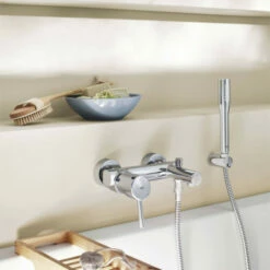Die GROHE Concetto EH-Wannenbatterie ist ausgestattet mit der GROHE StarLight® Chromoberfläche, einer GROHE SilkMove® 46 mm Keramikkartusche, einer variabel einstellbaren Mengenbegrenzung und einer automatischen Umstellung von Wanne auf Brause, sowie einem Brauseabgang unten 1/2′ (eigensicher gegen Rückfließen). Zum Lieferumfang gehört eine Garnitur bestehend aus Handbrause Euphoria, Wandbrausehalter und Relexaflex-Schlauch 1/2′ x 1.500 mm.