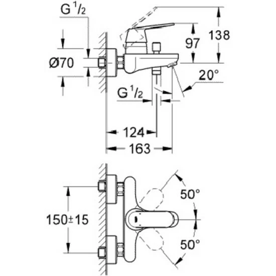GROHE Eurosmart Cosmopolitan Einhand-Wannenbatterie, DN 15 Wandmontage GROHE SilkMove 46 mm Keramikkartusche GROHE StarLight Oberfläche variabel einstellbare Mengenbegrenzung automatische Umstellung: Wanne/Brause Auslauf mit Mousseur integrierter Rückflussverhinderer im Brauseabgang 1/2“ S-Anschlüsse Eigensicher gegen Rückfließenchrom