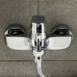 „Wandmontage, SilkMove 46 mm Keramikkartusche, variabel einstellbare Mengenbegrenzung, StarLight Oberfläche, Bedienungshebel aus Metall, automatische Umstellung Wanne/Brause, Auslauf mit Mousseur, integrierter Rückflussverhinderer im Brauseabgang 1/2″“, S-Anschlüsse, eigensicher gegen Rückfließen“