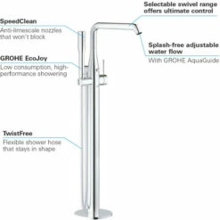 GROHE Essence Einhand-Wannenbatterie DN 15, Bodenmontage Fertigmontageset für 45 984 ohne Rohbau-Set GROHE SilkMove 35 mm Keramikkartusche mit Temperaturbegrenzer GROHE StarLight Oberfläche automatische Umstellung: Wanne/Brause schwenkbarer Auslauf mit Anschlagbegrenzung Ausladung 277 mm integrierter Rückflussverhinderer im Brauseabgang 1/2“ mit Brausehalter für chrom: Euphoria Cosmopolitan Stick Handbrause 27 806, für andere Oberflächen: Sena Stick Handbrause 26 465 Brauseschlauch Silverflex 1.250 mm (28 362) Eigensicher gegen Rückfließenchrom