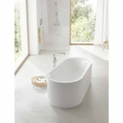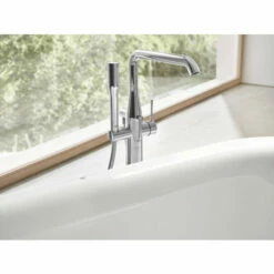 Die GROHE Essence Einhand-Wannenbatterie für die Bodenmontage wird ohne Rohbau-Set geliefert und ist mit einer GROHE SilkMove® 35 mm Keramikkartusche mit Temperaturbegrenzer, der GROHE StarLight® Chromoberfläche und einem schwenkbaren Auslauf mit Mousseur und Anschlagbegrenzung ausgestattet. Die Umstellung zwischen Wanne und Brause erfolgt automatisch. Die Ausladung beträgt 277 mm. Zum weiteren Lieferumfang gehört der im Brauseabgang integrierte Rückflussverhinderer, die Handbrause Euphoria Cosmopolitan sowie der Brauseschlauch Silverflex 1250 mm.