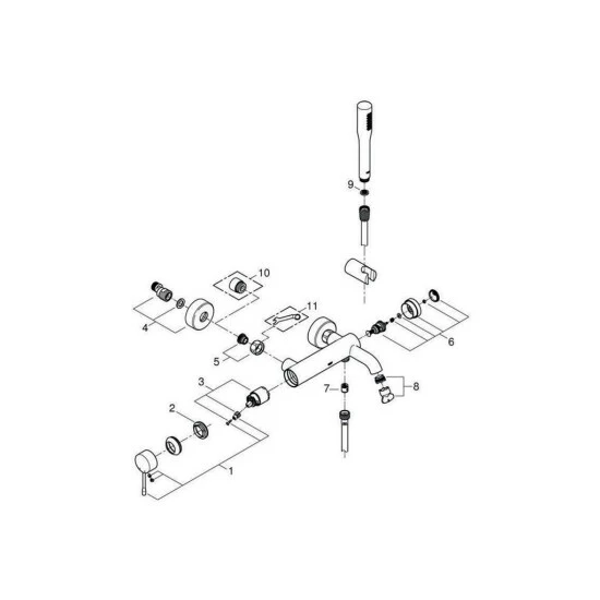 GROHE Essence Einhand-Wannenbatterie, 1/2“ Wandmontage GROHE SilkMove 35 mm Keramikkartusche mit Temperaturbegrenzer GROHE StarLight Oberfläche automatische Umstellung: Wanne/Brause Auslauf mit Mousseur Brauseabgang unten 1/2“ integrierter Rückflussverhinderer S-Anschlüsse Eigensicher gegen Rückfließen mit Brausegarnitur Handbrause Euphoria C (27 400) 6,6 l/min Euphoria Cosmopolitan Stick Handbrause (27 367) Handbrausehalter Tempesta 100 C (27 594) Brauseschlauch Silverflex 1.500 mm (28 364)