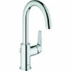 GROHE Essence Einhand-Waschtischbatterie, DN 15 S-Size Einlochmontage GROHE SilkMove 28 mm Keramikkartusche mit Temperaturbegrenzer GROHE StarLight Oberfläche GROHE EcoJoy 5,7 l/min Mousseur GROHE AquaGuide verstellbarer Mousseur GROHE QuickFix Plus Schnellbefestigungssystem Zugstangen-Ablaufgarnitur 1 1/4“ flexible Anschlussschläuche cool sunrise
