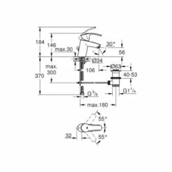 DN 15, S-Size, Einlochmontage, Bedienungshebel aus Metall, GROHE SilkMove 35 mm Keramikkartusche, mit Temperaturbegrenzer, variabel einstellbare Mengenbegrenzung, GROHE StarLight Chromoberfläche, GROHE EcoJoy 5,7 l/min Mousseur, Zugstangen-Ablaufgarnitur 1 1/4“, flexible Anschlussschläuche, GROHE QuickFix Schnellbefestigungssystem