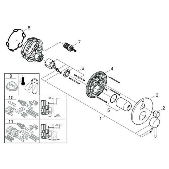 GROHE Essence Einhandbatterie mit 3-Wege Umstellung Fertigmontageset für Rapido SmartBox (35 600) GROHE SilkMove 46 mm Keramikkartusche GROHE StarLight Oberfläche Wandrosette mit GROHE QuickFix mit verdeckter Rosetten- und Schaftabdichtung, verdeckte Befestigung Rosette aus Metall, nachträglich 6 Grad ausrichtbar Bedienungshebel aus Metall 3-Wege Umstellung Durchfluss: Abgang A = 27 l/min, Abgang B = 27 l/min, Abgang C = 27 l/min ohne Rohbau-Set hard graphite gebürstet