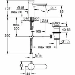 GROHE Eurosmart CT Selbstschluss-Waschtischbatterie, DN 15 mit Mischung und variabel einstellbarem Temperaturbegrenzer GROHE StarLight Oberfläche Zugstangen-Ablaufgarnitur 1 1/4“ Laufzeiteinstellung kurz, mittel oder lang (Werkseinstellung: kurz) ca. 7, 15 oder 30 sek. (druckabhängig) Druckbereich 0,5 bis 6 bar 2 flexible Anschlussschläuche Rückflussverhinderer Schmutzfangsiebe, chrom