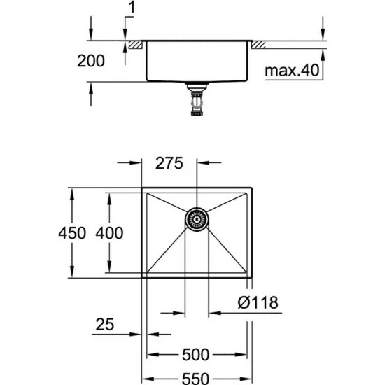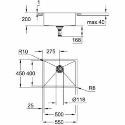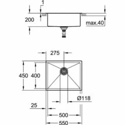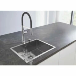 Modell: K700 60-S 55/45 1.0 – Installation: Unterputz oder Unterputz – Material: Edelstahl AISI 304 (18/10) – Materialstärke: 1 mm – GROHE StarLight hell und langlebig – 1 Schüssel : 500 x 400 x 200 mm – GROHE QuickFix-Schnellinstallation – Ausschnitt (von unten anzubringen): 502 x 402 mm (R11)
