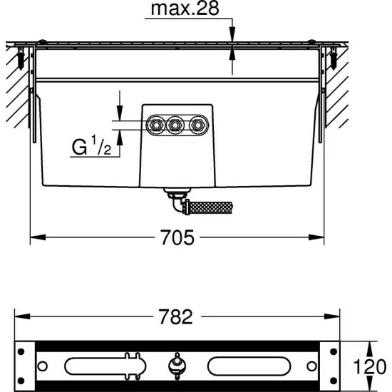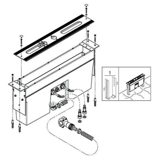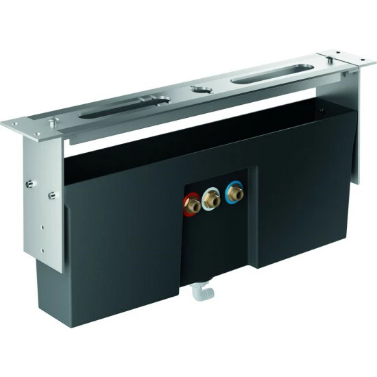 Unterbau für Fliesenbankmontage, bestehend aus: Grundrahmen, Auffangsystem mit integriertem Ablauf für eindringendes Spritzwasser