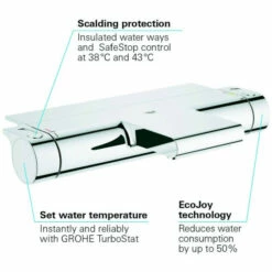 Wandmontage · EcoJoy Wasserspar-Technologie · CoolTouch-Sicherheitsgehäuse · SafeStop Sicherheitssperre bei 38 °C · TurboStat Kompaktkartusche mit Dehnstoff-Thermoelement · integrierte Mischwasserabsperrung · Carbodur Keramik-Oberteil 1/2″ · 180° · AquaDimmer Eco
