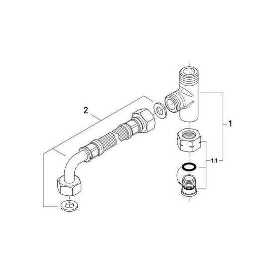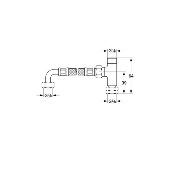 einem T-Stück mit Anschlussmutter 3/8′, 2 Abgängen 3/8′, Außengewinde, einem flexiblen Anschlussschlauch, Anschlussmuttern. Die Chromoberfläche wurde mit GROHE StarLight® versehen.
