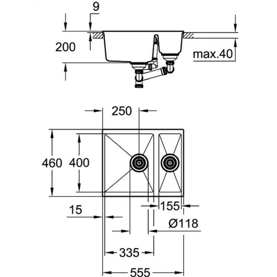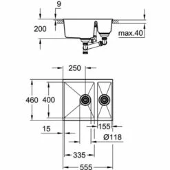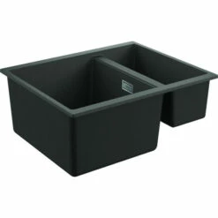 „Standard-Einbau und Unterbau, Quartzkomposit, Grohe Whisper, min. Maß Unterschrank: 600 mm, 1 Becken: 335 x 400 x 200 mm, 0,5 Becken: 155 x 400 x 140 mm, QuickFix Schnellbefestigungssystem, Spüle links oder rechts einbaubar, Ausschnittmaß: 525 x 400 mm, Ablauf: Ø 3,5″“ / 90 mm, mit Ablaufgarnitur, Siebkorbventil, Montageset“