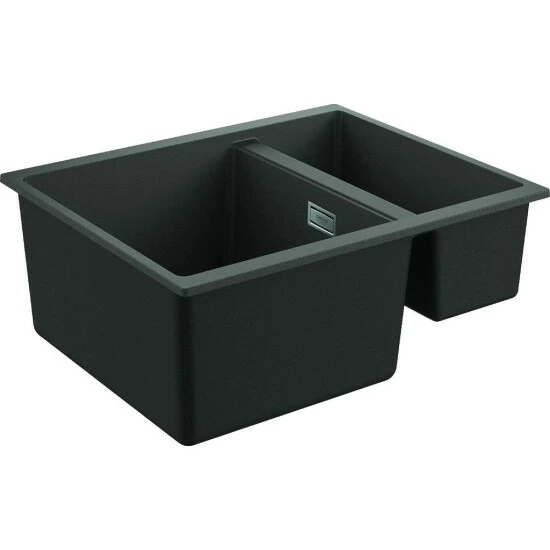 GROHE K500 Kompositspüle Modell: K500 60-C 55,5/46 1.5 rev Montageart: Unterbau oder aufliegend Material: Quartzkomposit GROHE Whisper min. Maß Unterschrank: 600 mm Maße: 555 x 460 mm 1 Becken: 335 x 400 x 200 mm 0,5 Becken: 155 x 400 x 140 mm Außenradius: R6, Innenradius: Großes Becken R12, kleines Becken R10 GROHE FastFixation Schnellbefestigungssystem Spüle links oder rechts einbaubar Ausschnittmaß: 525 x 400 mm Ablauf: D: 3,5“/ 90 mm Siebkorbventil Zubehör beiliegend: Ablaufgarnitur, Siebkorbventil, Montageset Montage mit Silikon Exzenterbedienung optional erhältlich (40 986 SD0) Anzahl der enthaltenen Befestigungsklammern: 8 hitzebeständig bis zu 180 Grad C