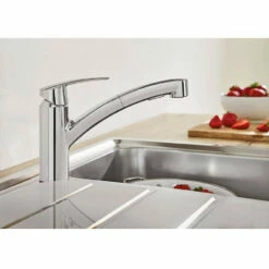 FG START SP-EHM mit Brause Einlochmontage, GROHE StarLight® Oberfläche, GROHE SilkMove® 35 mm Keramikkartusche mit integriertem Temperaturbegrenzer variabel einstellbare Mengenbegrenzung, Schwenkbarer Rohrauslauf, Schwenkbereich 90°, Getrennte innenliegende Wasserwege kein Kontakt mit Blei oder Nickel, Herausziehbare Dual Spülbrause – einfaches Umschalten zwischen Mousseur und Brausestrahl, Umstellung: Mousseur/SpeedClean Brausestrahl, Automatische Rückstellung auf Mousseur, Schnell-Montage-System, Eigensicher gegen Rückfließen, Farbe: verchromt