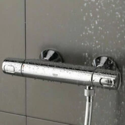 Das Brausethermostat für Duschgenuss ohne böse Überraschungen GROHE Precision Trend Neu Brausethermostat Kennen Sie das?Sie stehen unter der Dusche und plötzlich wird das Wasser eiskalt, weil gleichzeitig eine andere Armatur betätigt wird. Das wird Ihnen mit diesem Brausethermostat nicht passieren!GROHE TurboStat® heißt die Technik, die Ihnen konstant die gewünschte Wassertemperatur liefert.Zu Ihrer Sicherheit steigt diese nicht über 38 °C, es sei denn, Sie heben die Temperaturbegrenzung mit der SafeStop Taste auf.Die GROHE CoolTouch Technologie verhindert zudem ein Aufheizen des Armaturkörpers.Und wer Wasser sparen möchte, kann dies mit dem umweltschonenden EcoButton tun.Optisch glänzt der Thermostat mit pflegeleichter GROHE StarLight chromoberfläche und ergonomischen Metallgriffen.Einfach an vorhandene Wasseranschlüsse anschließen und genießen!