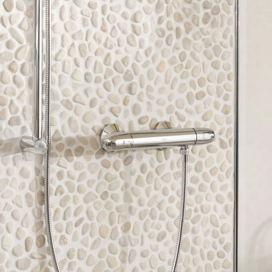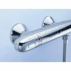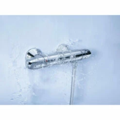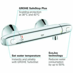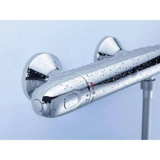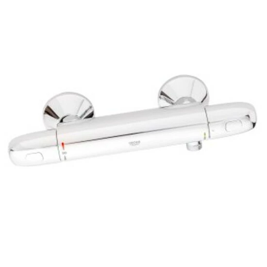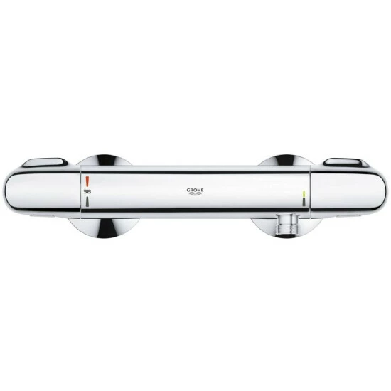 Die GROHE Grohtherm 1000 Thermostat-Brausebatterie ist mit einem CoolTouch Sicherheitsgehäuse gebaut und hat die Grohe StarLight Oberfläche versehen.