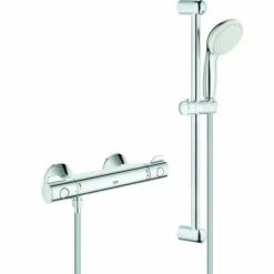 Die Thermostatarmatur Grohtherm 800 von Grohe im Set mit Handbrause, Brausestange und Brauseschlauch stattet Sie aus für flexibles Duschen – höhenverstellbar, mit 2 Strahlarten und konstanter Wassertemperatur.