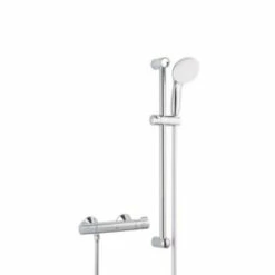 Die komfortable Handbrause mit Regenstrahl und massierendem Jet-Strahl wird ergänzt durch eine Brausestange mit Schieber. Dadurch ist die Brause höhenverstellbar. Noch mehr Komfort verspricht die enthaltene Thermostatarmatur: Plötzliche Temperaturschwankungen gehören damit der Vergangenheit an. Zusätzlich haben sie eine mechanische Begrenzung bei 38 °C und können eine Maximaltemperatur von 43 °C einstellen. So kann die ganze Familie sorglos duschen!