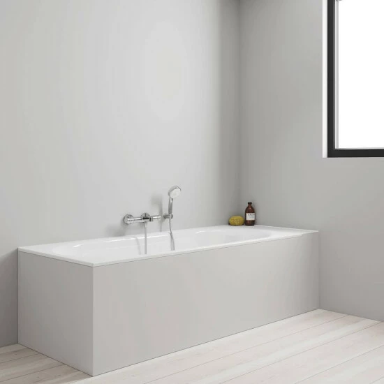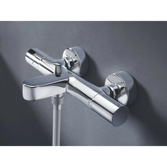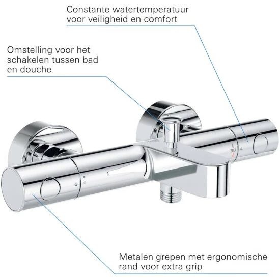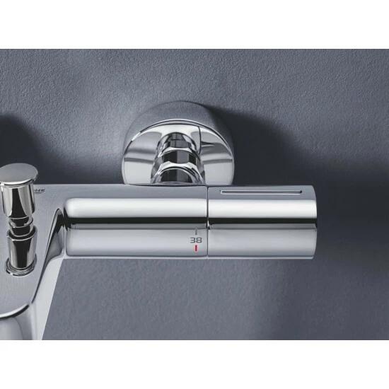 GROHE Grohtherm 800 Cosmopolitan Thermostat-Wannenbatterie, 1/2“ Wandmontage GROHE StarLight Oberfläche GROHE MetalGrip ergonomischer Metallgriff GROHE SafeStop Sicherheitssperre bei 38 GradC GROHE SafeStop Plus optional einsetzbarer Temperaturendanschlag bei 43 GradC GROHE TurboStat Kompaktkartusche mit Dehnstoff-Thermoelement integrierte Mischwasserabsperrung automatische Umstellung: Wanne/Brause Mengengriff mit GROHE EcoButton (Spartaste mit individuell einstellbarem Sparanschlag) Keramik-Oberteil 1/2“, 180 Grad Brauseabgang unten 1/2“ Auslauf mit Mousseur eingebaute Rückflussverhinderer, Schmutzfangsiebe Eigensicher gegen Rückfließen S-Anschlüsse Metallrosetten GROHE EcoJoy Wasserspar-Technologie