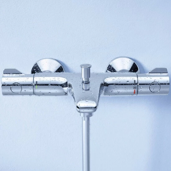 Die GROHE Grotherm 800 Thermostat-Wannenbatterie ist ausgestattet mit der GROHE StarLight® Chromoberfläche, der GROHE TurboStat®Kompaktkartusche mit Dehnstoff-Thermoelement und der GROHE SafeStop® Sicherheitstemperatursperre bei 38°C.