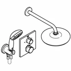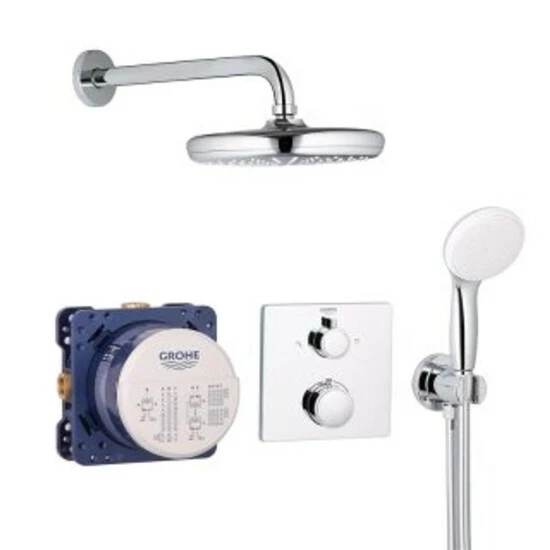 bestehend aus: Grohtherm Thermostat mit integrierter 2-Wege Umstellung für Dusche mit mehr als einer Brause (24079), Rapido SmartBox (35600), Tempesta 210 Kopfbrause (26410), Brausearm Rainshower 286 mm (28576), Tempesta 100 Handbrause 2 Strahlarten, 9,5 l/min (27597), Wandanschlussbogen (28628), Brauseschlauch Rotaflex 1500 mm (28409)