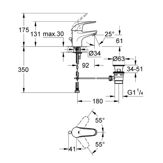 Der Abfluss hat einen 1 ”1/4 Pop-up-Ablauf, der durch den kleinen Hebel auf der Rückseite bedient wird. In der Verpackung befindet sich ein Set für Befestigungs- und flexible Beschläge. Die Installation ist schnell und einfach, während die Wartungsarbeiten minimal sind: Reinigen Sie den Mischer einfach mit einem neutralen Reinigungsmittel und trocknen Sie ihn mit einem Tuch, damit er wieder glänzt.