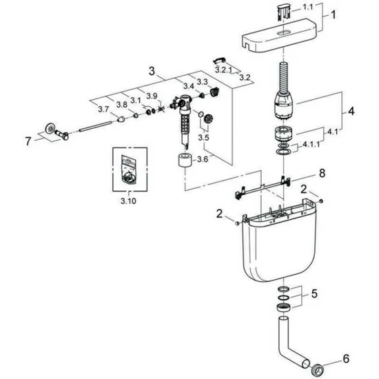 unterbrechbar, Servobetätigung, tiefhängend, aus ABS, schwitzwasservollisoliert, Eckventil DN 15, Kupferrohr, Montageschablone, Spülrohrbogen, WC-Innenverbinder